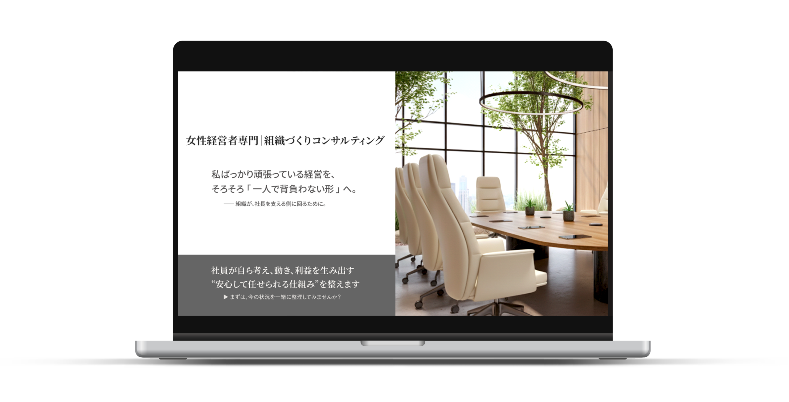 コンサルサイトFV 2026年4月16日 最終更新日時 : 2026年4月18日 nyako-design ■目的コンサルHPのファーストビュー設計 ■ターゲット年商2〜5億規模の女性経営者/組織や将来に不安を抱える層 ■工夫・余白設計で落ち着きと安心感を演出・明るいオフィスビジュアルで信頼と共感を形成・売り込みを抑えた構成で自然な興味喚起を重視 ■制作ツールPhotoshop \ 最新情報をチェック /